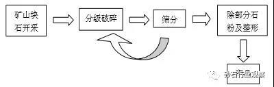 一般礦山開采得到的母巖經(jīng)顎式破碎機(jī)粗碎、再經(jīng)反擊式破碎機(jī)中碎、最終經(jīng)沖擊式破碎機(jī)細(xì)碎制砂,篩分大于4.75mm的巖石顆粒返回破碎,小于4.75mm的砂石顆粒再根據(jù)當(dāng)?shù)貤l件選用干法或濕法的除粉工藝調(diào)整石粉含量,最終得到產(chǎn)品。