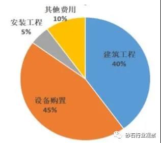 圖2為某機(jī)制砂企業(yè)項(xiàng)目建設(shè)階段的各方面資金投入占總投入的占比。如圖2所示,設(shè)備購置費(fèi)為該機(jī)制砂項(xiàng)目最大的投入,占比約45%;投資額第二大的為建筑工程,占比約40%(含土地征用);其他費(fèi)用含土地征用租用(礦山邊的多為租用)、基本預(yù)備費(fèi)及相關(guān)費(fèi)用等??梢娫O(shè)備購置費(fèi)用和建筑工程的花費(fèi)控制是項(xiàng)目建設(shè)階段投入控制的要點(diǎn)。