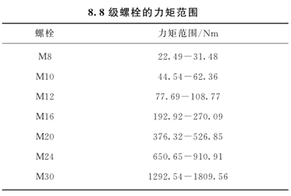 建議不要采用4.8級的螺栓以緊固振動篩各部位,而需采用8.8級螺栓,其力矩范圍見下表: