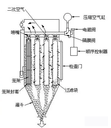 清灰時(shí)間間隔過長,附著于濾袋上的粉塵不能及時(shí)消除,造成系統(tǒng)阻力增加。一般間隔時(shí)間為4s左右(可根據(jù)實(shí)際生產(chǎn)情況調(diào)整)噴吹,噴吹時(shí)間為0.2s~0.3s,室與室的時(shí)間間隔為30s左右。